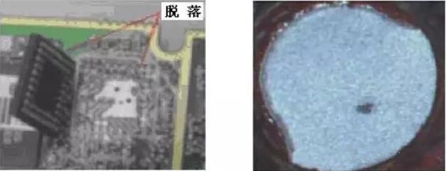 這種焊點,釬料是黏附在焊盤表面上的,有時表現得毫無連接強度可言。圖為一塊PCBA上的CSP芯片,由于冷焊,一受力芯片便撕裂下來。器件與焊盤分離后,焊盤表面潔凈且呈金屬光澤,如右圖所示。它與分離后的虛焊點的焊盤表面是完全不同的。