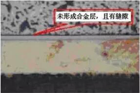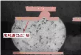 冷焊發生的原因主要是焊接時熱量供給不足,焊接溫度未達到釬料的潤濕溫度,因而結合界面上沒有形成IMC或IMC過薄,如左圖所示。有的情況下,界面上還存在著裂縫,如圖所示。
