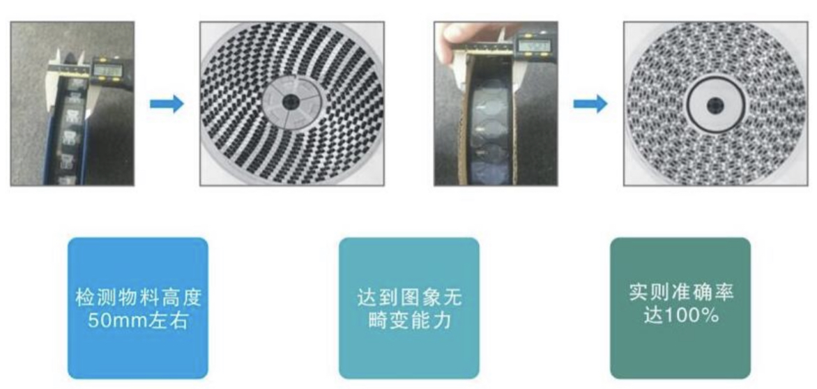 設(shè)備能檢50mm左右的高度物料,目前市場能達到要求,圖像無畸變的能力。