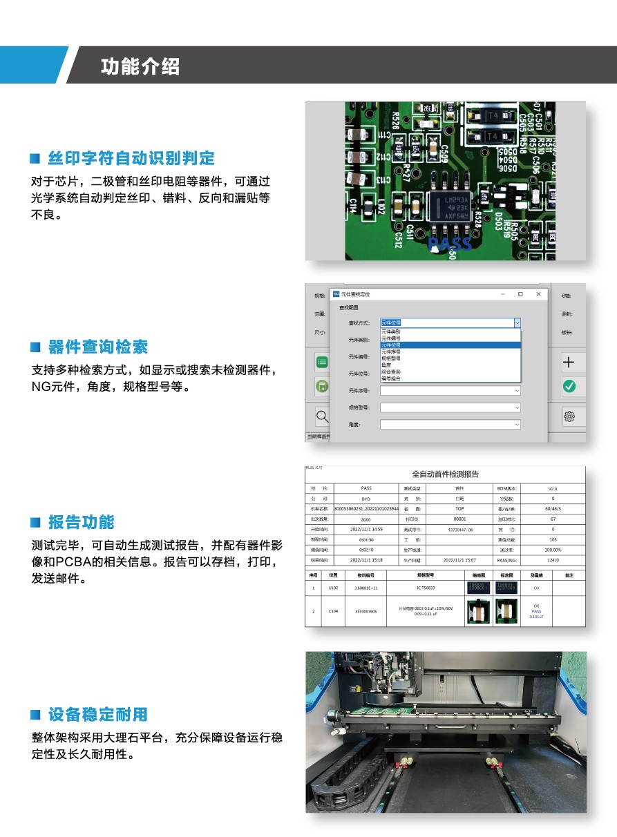 設(shè)備功能 | 自動(dòng)測值、絲印、元件錯(cuò)、漏、反及多件檢查 |